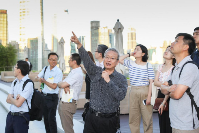 恒隆地产总经理 - 项目管理陈启基先生(左四)带领与会者参观上海的恒隆广场平台花园,深入了解恒隆广场·上海的建筑设计。