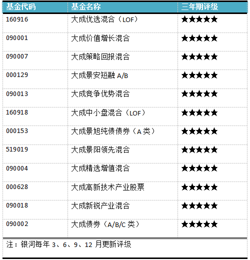 根据银河证券最新出炉的2018年6月评级报告,全市场共有215只基金产品获评三年期五星评级,其中大成基金旗下产品有12只位列其中,数量位居全行业第一。