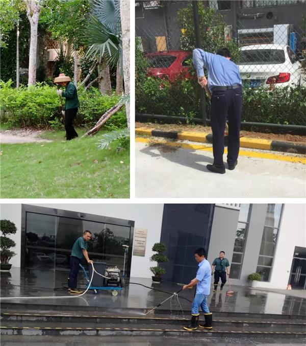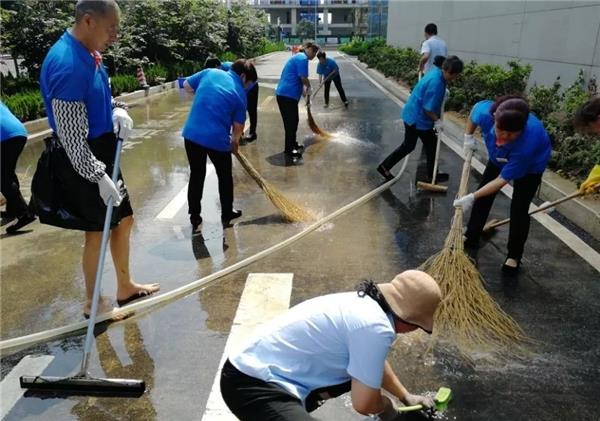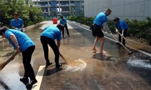 中民未来旗下山东宏泰物业所管理的济南市西城大厦,因为外围消防通道施工而导致地面有淤泥残留。当天正是36度的高温,为了杜绝安全隐患、保障环境美观,下午4点,在项目经理张磊磊的带领下,项目工作人员集体加班加点冲刷清洁地面,一直工作到晚上7点多;第二天一早,在保洁主管赵惠的带领下,保洁部员工冒着高温酷暑的天气清刷外围地面,直至地面清刷干净,看到地面干净如初,保洁员们顾不上擦一擦汗水,露出了欣慰的笑容。