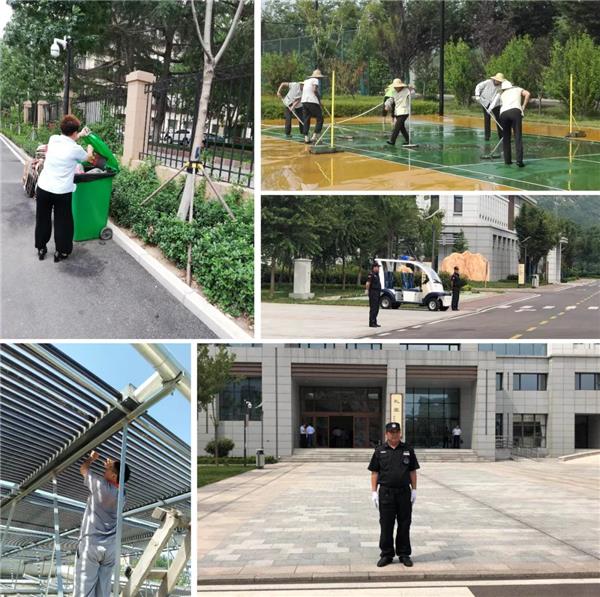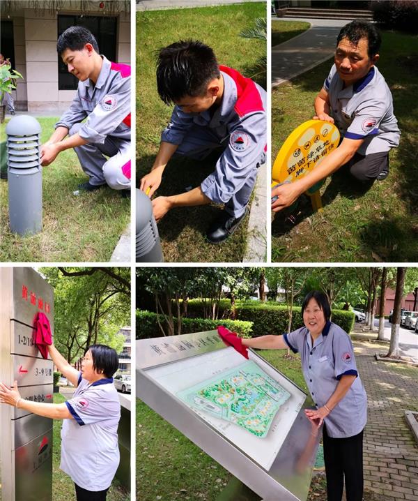 道路旁,保洁员头顶烈日,汗流肩颈,一丝不苟地擦拭着小区内的公共设施;池塘中,保洁员穿着闷热的防水裤、涉水而立,认真地擦拭警示牌,默默提醒着业主们注意安全;草坪上,工程师面对着蒸腾的热气,坚持着例行对草坪灯进行日常的维护检修工作;岗亭下,秩序维护员恪尽职守,守护着小区的一方平安……