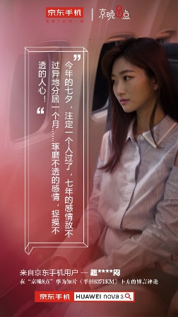 京东手机联手 “京晚8点”打造华为情感大片——《半径6371km》,故事根据真人真事改编,讲述了一对“异国恋人”,相隔一万公里,相差12小时时差的爱情故事。手机作为贯穿剧情、连接情感、跨越时间空间的核心元素,相差12小时时差的“晚8点”视频通话,又契合“京晚8点“IP主题内容。