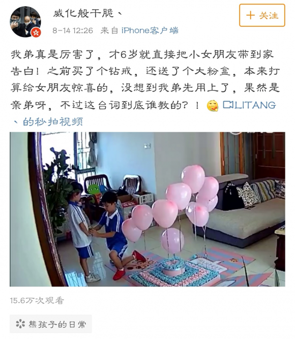 8月14日,微博一网友上传了一个用自家监控记录下来的视频,视频里很清楚能看到两个身着校服的小学生站在有标识“珂兰盒理人”字样的粉色大盒子面前,进行着一场疑似告白求婚的浪漫仪式。