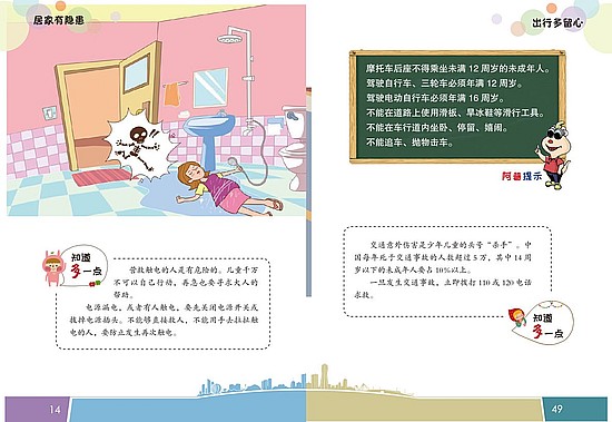 《保护自己、爱惜生命:儿童安全保护指导1》一书中,居家有隐患、家有两个宝、校园有暗雷、出行多留心、水火最无情,5个板块,26个真实发生的故事,暴露出生活中确实存在的儿童安全问题。一个故事一个对策,从“知道多一点”的安全锦囊,到“爸爸妈妈一起来”的家长责任,再到“阿普说法”的法律知识,从家长、孩子、学校、社会等多个方面多发联动,真正起到保护儿童的科普功能。