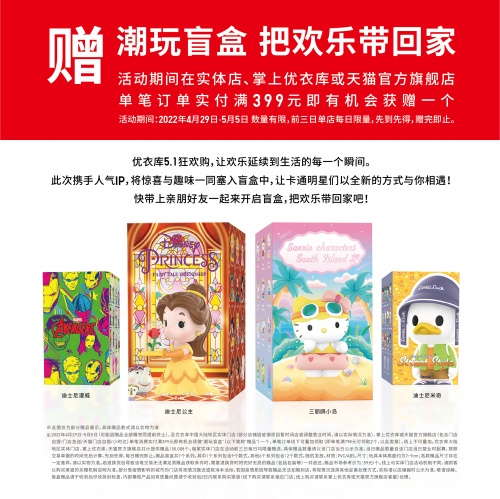 4月29日起,任意消费满399元即有机会获赠限定潮玩盲盒;购指定款泡泡玛特联名UT有机会获赠限定趣味发箍1个。5月1日-31日,新会员注册可领专享优惠券,单笔实付满300元即可享受20元优惠。
