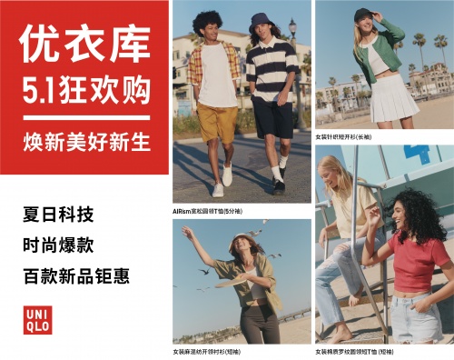 在“五一”小长假到来之际,消费者渴望开启久违的美好新生活。洞察消费者假期购物和对健康活力、焕彩风尚生活的追求,优衣库启动“5.1狂欢购”活动,以LifeWear的艺术与科学带来夏日科技和时尚爆款系列,推出百款新品钜惠59元起,焕新美好新生。夏日科技系列采用持续进化的四大高功能面料,包括UPF50+瞬间防晒的优衣库防晒衣、网球天王同款·1秒吸汗的优衣库速干衣和360°全方位高弹的优衣库高弹裤。时尚爆款系列包括优衣库泡泡玛特联名款UT、高腰短款辣妹风系列、Uniqlo x Theory和Uniqlo xMame设计师合作系列等缤纷时尚新品。