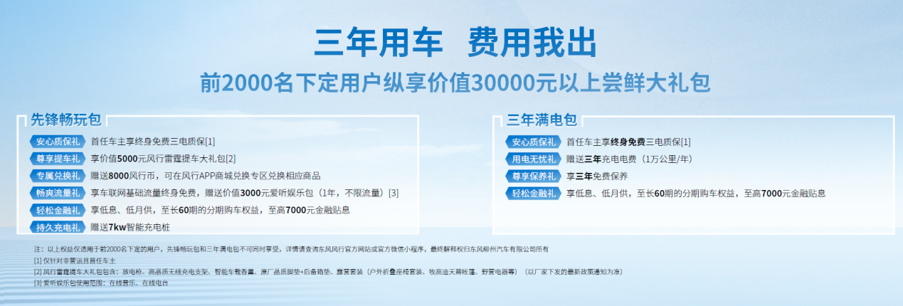 风行雷霆不仅给消费者带来更好的纯电出行体验,同时也给消费者送上了“三年用车,费用我出”的用车豪礼,即日起,前2000名下订风行雷霆的首任车主可享价值30000元以上的尝鲜大礼包,包括先锋畅玩包或三年满电包。