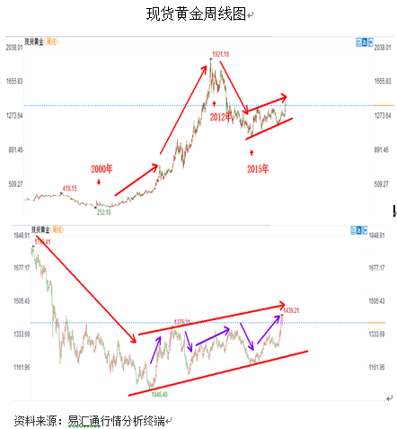 从黄金现货周线走势图看,2000年-2015年是黄金的一个涨跌大周期,其中2000年-2012年这12年,是金价的上涨阶段;2012年-2015年这3年,是金价的下跌阶段。2015年,金价开始触底转向,进入“慢牛”通道。在此过程中,金价两次短期下行波动,分别是2016年下半年和2018年前三季度;三次上行波动,分别是2016年上半年、2017年、2018年最后一季度至今。此外,“慢牛”通道中的最低点逐次提高,对金价上涨形成有效的底部支撑。