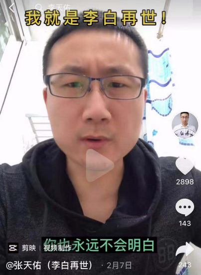 4、张天佑打出“李白再世”旗号后是什么心理状态呢?好多人以为是臭美、骄妄,不对,其实真相是他很痛苦!不知道他这一决策思考了多久,按正常逻辑,如果他真是水平非常高的话(起码他自己这么认为),达到了一流大诗人的水平,是不甘心做别人的影子的,你只会是你自己。李白基本代表了诗人能达到的最高水平,即使将来有某人能超过他,但被认可也需要一个过程,在大众接受之前,打李白再世的旗号,只会引起大众的反感,张天佑不会不明白这个逻辑,自我加冕实际等于先往自己身上泼了一盆脏水,如果开始就纯粹打算炒作的话,自然另当别论(炒作李白再世其实是很蠢的行为,因为没人信),如果他真觉得自己水平极高,这种抉择无疑会造成内心的极大痛苦。其实看他发视频的表情就可以看出来,绝对是愤懑加痛苦。就像他自己说的“李白再世,这几个字是应该由我说出来的吗?”