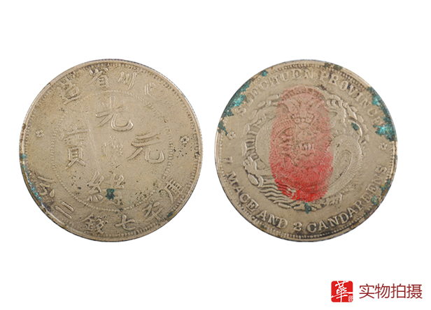 此枚光绪元宝“四川省造”七钱二分银币,直径:3.89cm。正面珠圈内铸“光绪元宝”汉文四字,珠圈外上环“四川省造”,下环书“库平七钱二分”,左右梅花星点;钱币背面内圈铸有蟠龙腾飞图腾,外圈铸有英文,品相精致。