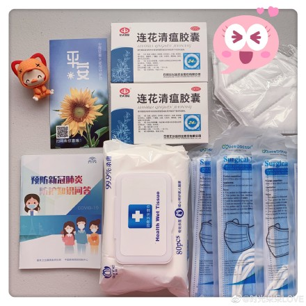 健康包里有连花清瘟胶囊、口罩、消毒液等防疫物品。
