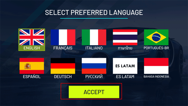 1、打开并进入游戏,需要选择你熟悉的语言,选中其中一个后点击“ACCEPT”。