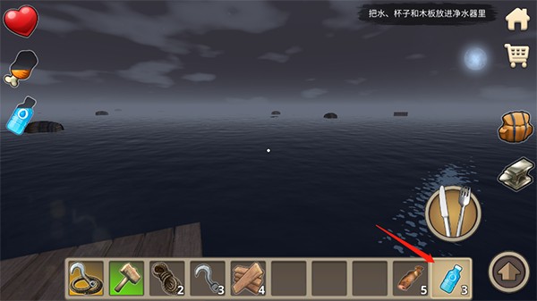 5、勾住物品后再次点击钩子按键,将勾住的物品拉回至木筏旁边。